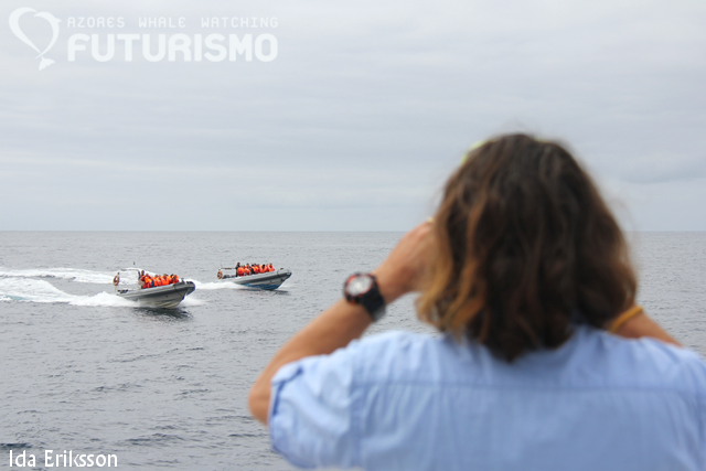 Blue, fin and sei whales, they are the three largest animals in the world and this morning we saw these beautiful animals. We started our morning with three sei whales - the third largest animal in the world - we could see them very well. They were always stay calm on the surface. A few minutes later, we sailed a little and.. surprise!! A blue whale - the largest animal in the world - right next to us and more sei whales further away!! This blue whale were always near us, coming to the surface to breathe, show off its size and also with a very calm behaviour. After a while, we decide go to meet with our friends the dolphins. We started with common dolphins, the group were really calm and big, with newborn babies so cute and beautiful. To finish our morning we had another encounter with dolphins, but a mixed group of common dolphin with bottlenose dolphins, swimming in the same area - messing around with each other. When we stopped to see them, the bottlenose dolphins received us with fantastic high jumps. We had a fantastic morning with five different species of cetaceans (as some of our boats also encountered fin whales). Its are days like these that are worth everything and fill our hearts.