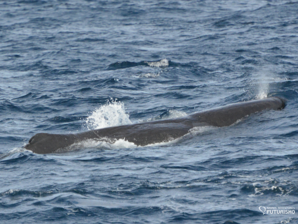 This morning we were lucky to have a large group of sperm whales a short trip away from Ponta Delgada. It was nice to see our resident whales again, after a period of seeing only fin whales recently. There were many sperm whales hanging out at the surface together, probably about 15 in total. For a moment they even became curious and turned towards us to check us out. After the whales we enjoyed some nice encounters with another one of our resident species - a group of at least 100 common dolphins. They were playing in the waves around our boats, even when we left they swam with us an lept alongside us for quite some time.