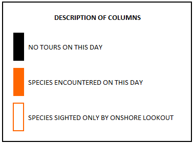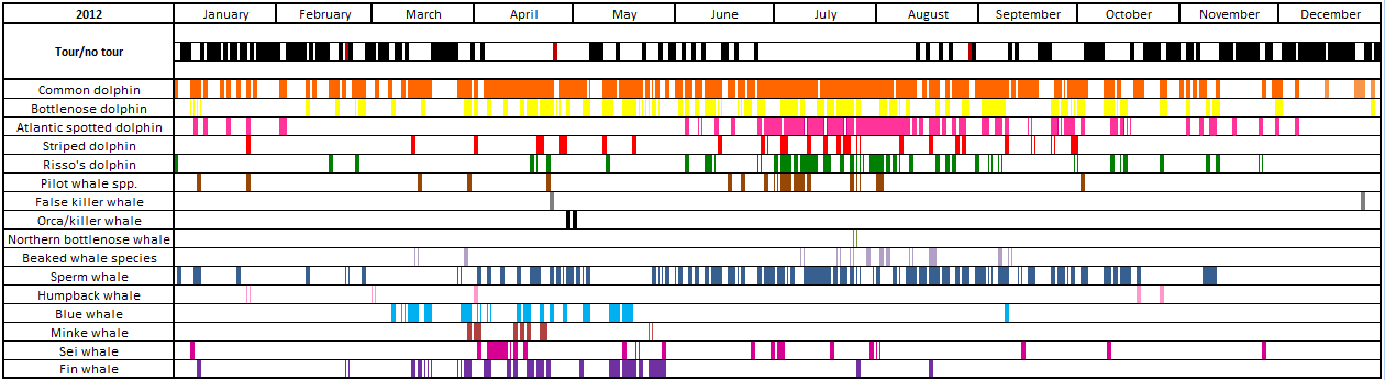 Species are individually colour coded and sightings are shown for every day of the year. A bar filled with colour indicates the species was sighted that particular day whereas a box outlined in colour but not filled indicates that species was sighted by our vigia (onshore lookout) but not encountered by our boats.