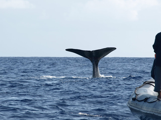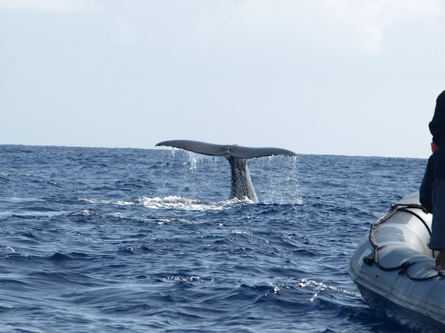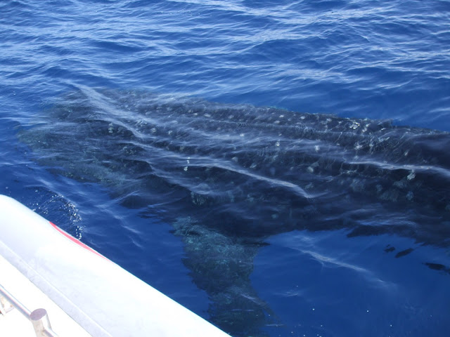 The whale shark is the largest non-mammalian vertebrate in the world. Unlike other sharks that are often aggressive and violent predators, whale sharks are docile creatures. They move slowly, covering areas as large as 3,700 km and they can dive as deep as 1280 m. Whale sharks have a large mouth containing 10 filter pads that are used to filter plankton, squid and tiny fish that are rammed or engulfed into the mouth. Adults are able to eat more than 2.6 tons of food per day. Whale sharks are ovoviviparous, meaning that the eggs remain tin the body and the mother gives birth to live young. A single female may carry up to 300 embryos which develop at different times. Whale sharks are pelagic and inhabit all tropical and warm to temperate seas (generally below 30º latitude). Their appearance is regularly in the same places and seasons which likely correlates to events like plankton blooms. In the Azores whale sharks are sighted only occasionally when the water is particularly warm.