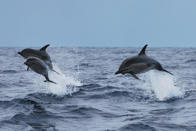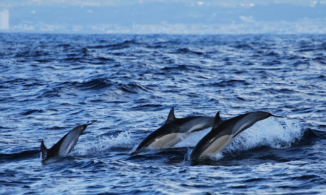 As the wind picked up a bit during our encounter it created good wave-surfing conditions for the dolphins. We were lucky to see some fantastic jumps out of the waves, including playful leaps from some of the youngsters that were in the group (such as the dolphin in the front left in the following photo)...