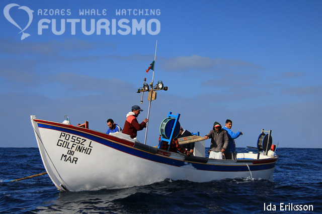 Today we had at least 150 dolphins around us, both common dolphins and bottlenose dolphins. The common dolphins were busy feeding and searching for food, but the bottlenose dolphins were curious, playful and full of energy. We got to play a lot with them, racing us, jumping high and bowriding, and we could hear them well from the boat. In one of the groups we got to see our well-known dolphin friends "Egípcio" and "Submarine". On our way back one of our crew members sighted a loggerhead turtle but it dove and we couldn't find it.