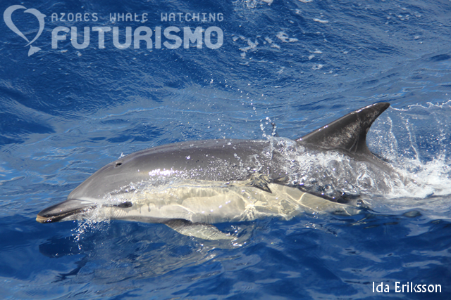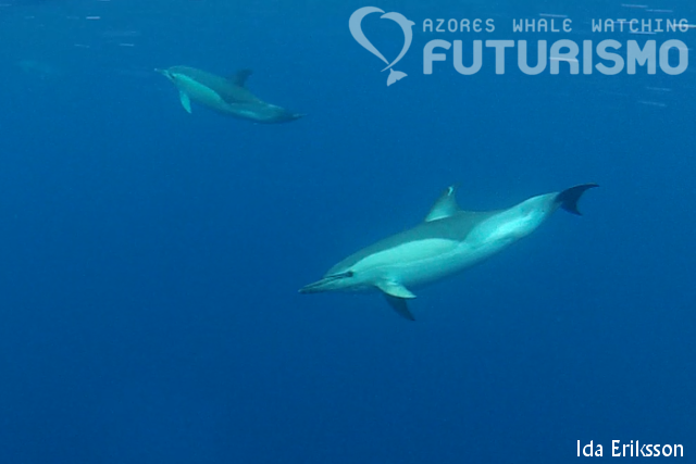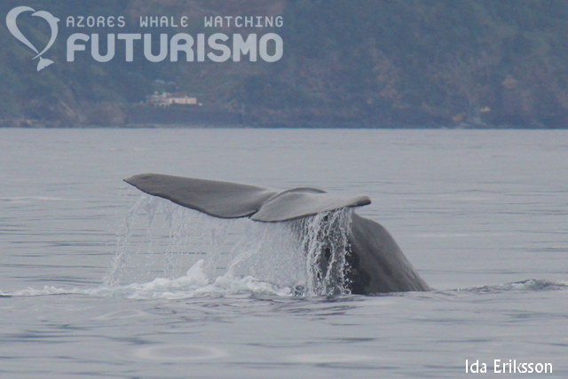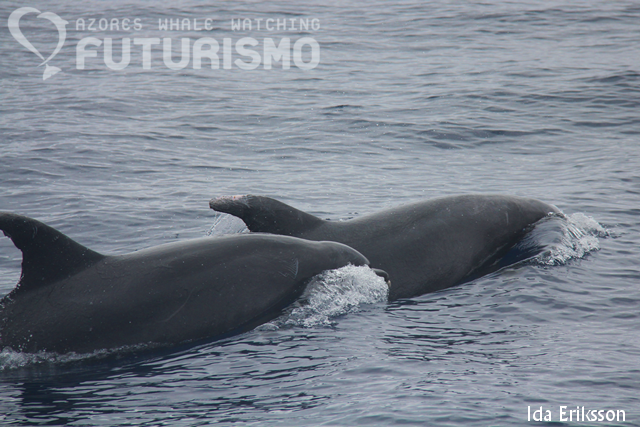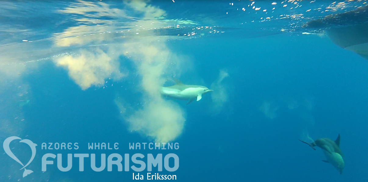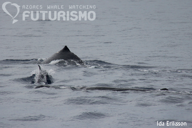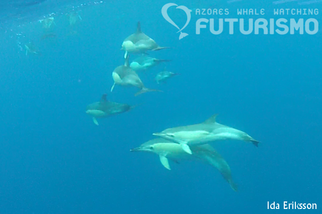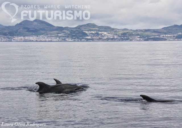 Today we had three boats leaving for the Full day tour, which includes whale watching in the morning, lunch in Vila Franca do Campo and snorkeling in Vila Franca Islet in the afternoon. We also had whale watching boats out there throughout the day and swimming boats. In the morning we had a sperm whale group far to the east, and they were not really in the mode of feeding and deep dives so we didn't get to see many tails ,but still they were wonderful. We also encountered common dolphins. In the afternoon the whales were too far away for us to go there as they went further east, but we had a large group of bottlenose dolphins and common dolphins with many new born babies. The bottlenose dolphins gave a special treat with some high, marvelous jumps (see photos).