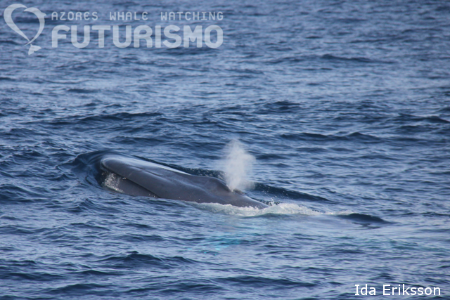 This afternoon we went out on our catamaran to see what we could find out in the big blue. Not far from our base in Ponta Delgada our lookout had seen some blows from a baleen whale. At this time of the year we have several baleen whale species migrating past (mostly fin whales, sei whales and blue whales), so we were curious to see which species it was. It wasn't easy work...in the begining we only had distant blows, and based on the behaviour we guessed we might be dealing with a sei whale. We tried for a while to see this whale but eventually we had to give up. We tried to search for something else in another area and luckily it didn't take long for one of our biologists to spot a blow not far from our boat. This whale turned out to be easier to track, as it was coming up to the surface for a few blows each time. It was a fin whale, the second largest animal in the world! We tracked the whale for a while, trying to predict where it was going to surface next (something which is not always easy). A couple of times the whale surfaced near our boat so our patience paid off. What an adventure!