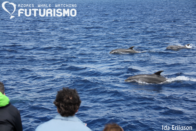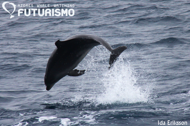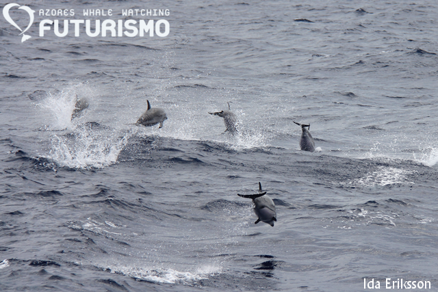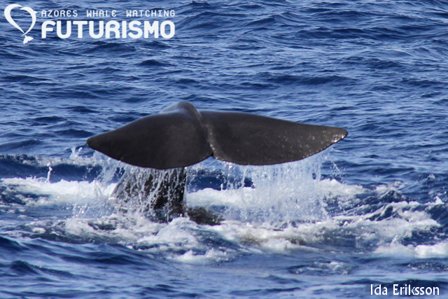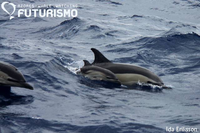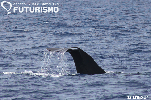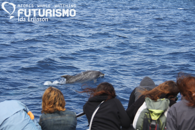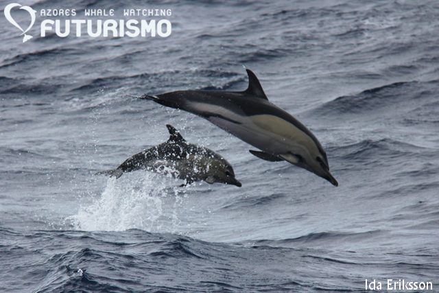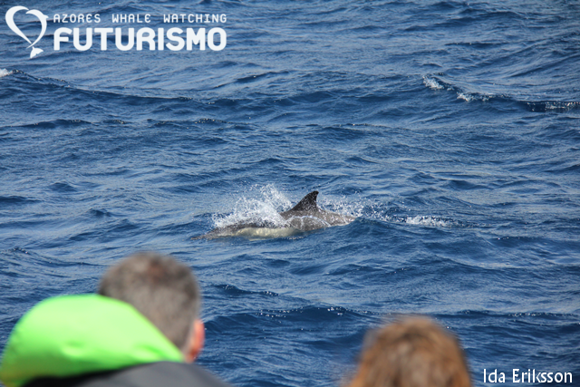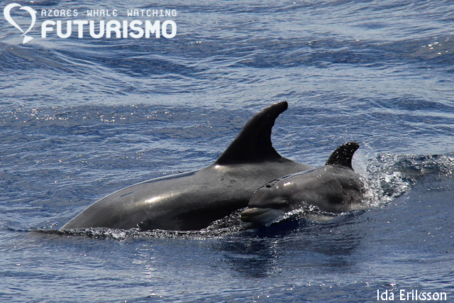 Today we passed to groups of dolphins, both common and bottlenose, as we were heading towards a sperm whale family. We arrived and could see blows far away. We encountered many females from this group and one of them gave us an extra show by breaching several times. Probably she needed to "release pressure" as we could see some brownish water and when we dived she also released some poop. With one of the whales we had bottlenose dolphins around. On our way back we stopped for both the common dolphins and the bottlenose dolphins, which had lots of new born babies.