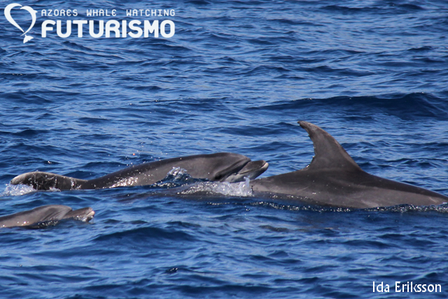 Today we sighted five different species throughout the day. In the morning we encountered sperm whales with a new born baby by their side. Some of our boats also encountered striped dolphins and common dolphins. In the afternoon we sighted a large group of pilot whales also with new born babies and later on a group of bottlenose dolphins making babies. Its always fun to see new born babies but also to see how they make the babies as we got some great jumps!