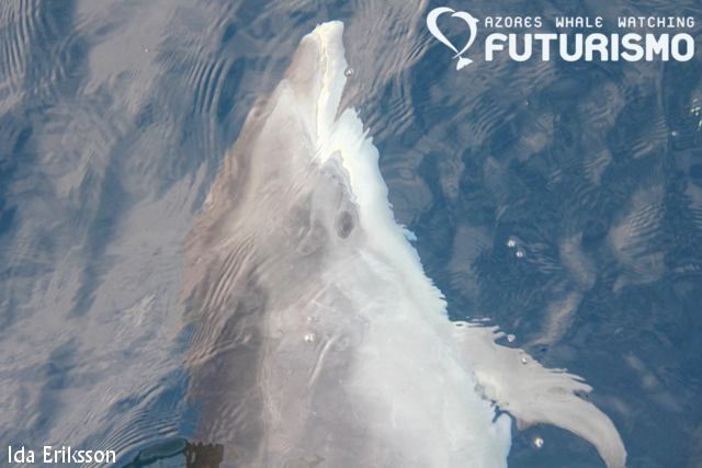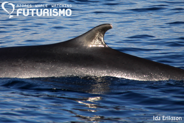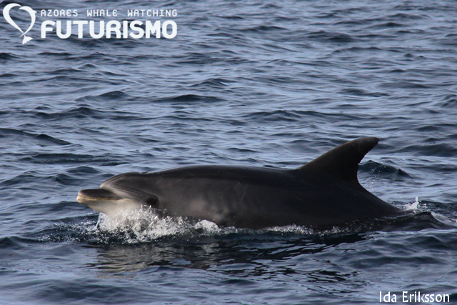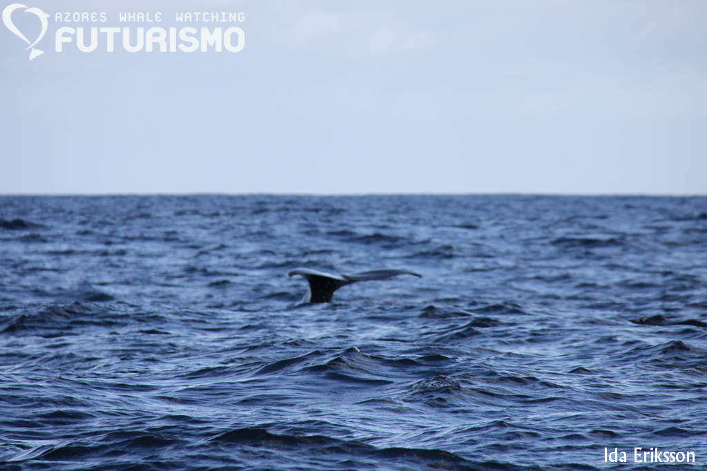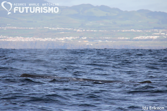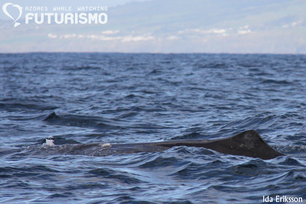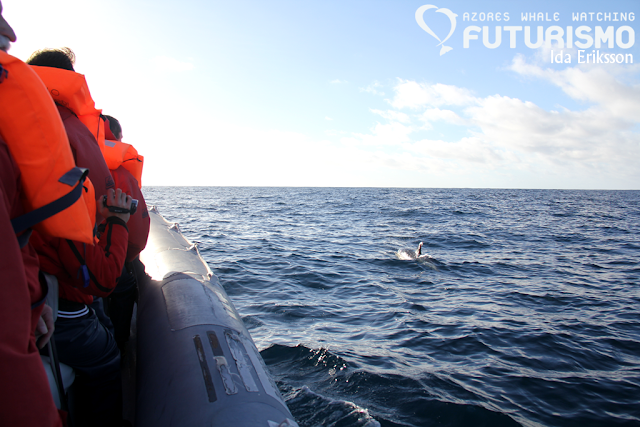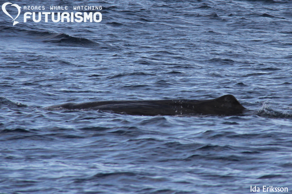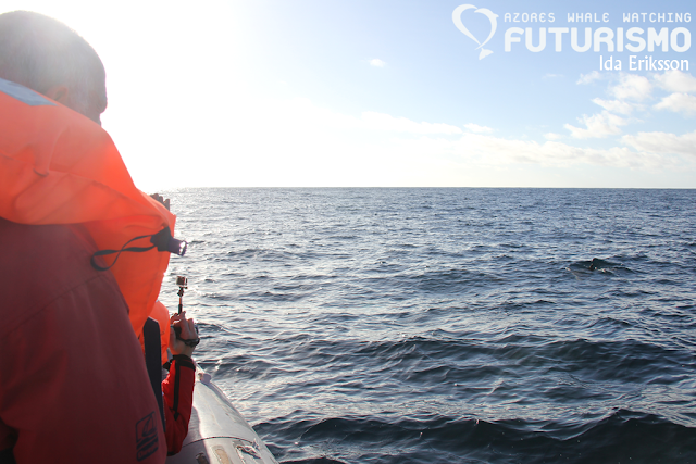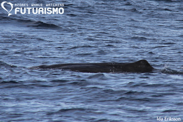 Today we set out on a wavy ocean, 11 brave clients on a small boat full of hope for something big. We did see something big, even if it was "just" a juvenile. We saw a sperm whale (cachalot or pottwal), it was travelling fast but all of a sudden it stopped, rolled around and started resting or logging on the surface. It gave us a small and low fluke, which I got a photo of but it is a bit blurry. But as a promise to my guests on board, it will be uploaded anyway as a memory. Before this whale we had an amazing time with common dolphins feeding on garfish and mackerel and jumping all around us. Almost difficult to leave them, but a whale is a whale. On our way back we stopped at Rocha de Relva to enjoy this beautiful place and rock formations.