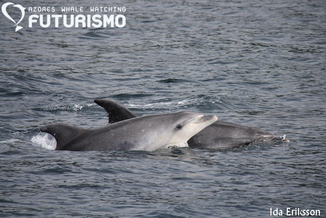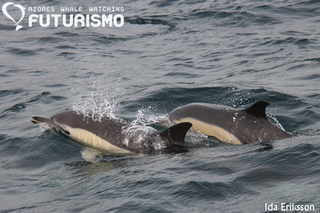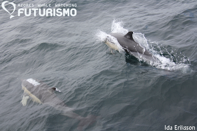 Today was another day of baleen whales. During the day our lookout spotted the blows of these great whales south of São Miguel Island. The whales were spending a lot of time diving, probably to feed, so it was not easy to encounter them from our boat, but we were lucky to encounter one in the morning. It was a fin whale, the second largest animal in the world, and with a bit of patience we got to see the whale at the surface several times. We tried for a whale again in the afternoon, but this time without luck. However, the afternoon was better than the morning in terms of dolphins. We spent some amazing moments with a group of about 40 playful common dolphins, watching them at eye level from our zodiac boat.