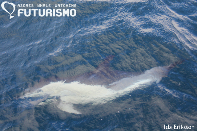 Today's list of species encountered is very long, a great sign that we are leaving the winter behind and entering the spring, which is a great time for species diversity in the Azores. We started the morning tour with a friendly group of our resident common dolphins. The sea was very calm and clear, almost like a summer's day. We got to see them really well as they were calmly bowriding and looking back at us. Next on the list was a group of almost 100 striped dolphins. As they often do, the striped dolphins were very energetic as they were surfacing in long leaps out of the water, often in unison. It's always great to see this offshore species of dolphin, especially when they put on a show like this. After the dolphins we went a bitfurther from the island in search of a whale that our lookout had spotted for us. It didn't take long before the whale was up and we could see very well it was a fin whale, the second largest animal in the world. Luckily for us its dives were short and it came up for several breaths and showed itself well. After the fin whale some of us also briefy spotted another smaller whale. We didn't see it well so cannot be sure what type of whale it was, but perhaps it was a beaked whale or a minke whale. As for non-cetacean species, in the morning we also encountered a very small swordfish, several marine birds and a fairly large loggerhead turtle. As we were watching the turtle we noticed it was behaving strangle, trying to come very high out of the water. We took in aboard to examine it for any signs of injuries or entanglement in fishing gear or plastic, but it seemed to be ok so we let the turtle go its own way.