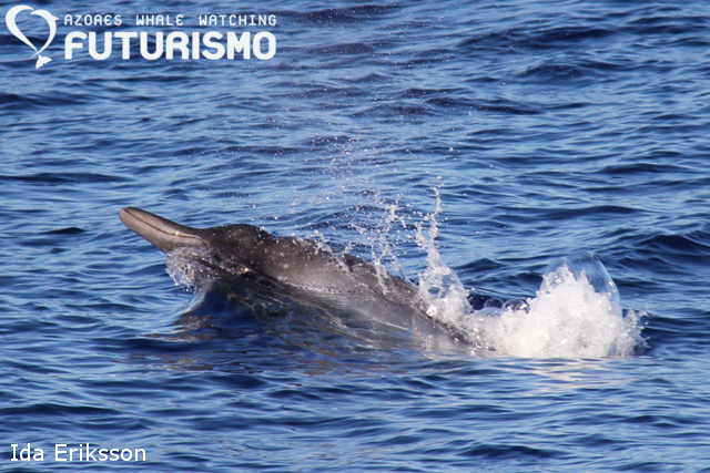 "Mr Liable" the big male sperm whale was with us in São Miguel again this morning. He can't have gone far because we saw him just two days ago. In the morning we also encountered familiar bottlenose dolphins; the group of "Bubblemaker" that we see here often. In the afternoon we started off with Bubblemaker's group, almost in the place where we had left them in the morning. After some time with them we headed offshore to where Mr Liable had last been seen, but unfortunately he had left as quickly as he arrived to the south coast of this island. We did find another group of bottlenose dolphins out there, this time an unfamiliar group that was very large and included many babies. It was nice to see them enjoying the waves and they even put in their best effort to race our boats as we left them to head back to base.