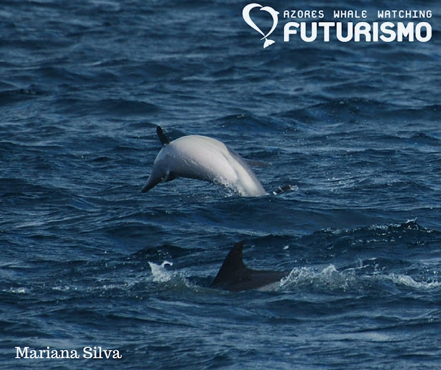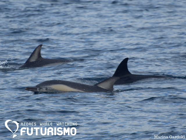 The weather in the azores is unstable, amazing and today was a great proof of that. Our morning wasn't easy because of the rain and the fog that didn't allow our lookouts do their job. They spotted a group of common dolphins that were lost in the middle of the rain. Unfortunately we could not find them because of the waves. In the afternoon we seemed to be on a totally different island.The sea was much calmer and with a few common dolphins close to the marina of ponta delgada. We went a little further to look for a group of bottlenose dolphins but they went for a deep dive in wich made it impossible for us to see them. But another group of common dolphins was making the joy of our guests full of energy and with many rainbows to look good in the photo.
